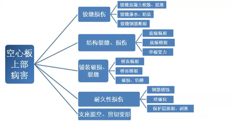 整桥病害:铰缝是板间传递内力的关键构件。铰缝损坏会大大削弱板间的横向联系,进而增大板受力,最终形成单板受力状态。