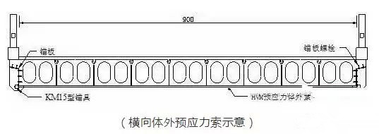 体外横向预应力加固原理为通过施加横向预应力使桥板横向下缘混凝土处于受压状态,平衡了横向弯矩,消除了应力集中的薄弱环节,空心板间可以同时传递竖向剪力和弯矩,变铰接板结构形式为刚接板结构形式,以增强装配式板桥的横向联结能力,改善了桥梁的横向分布,从而可提高装配式板桥的承载能力。近年来,体外横向预应力加固法在空心板桥的加固中应用逐渐增多。