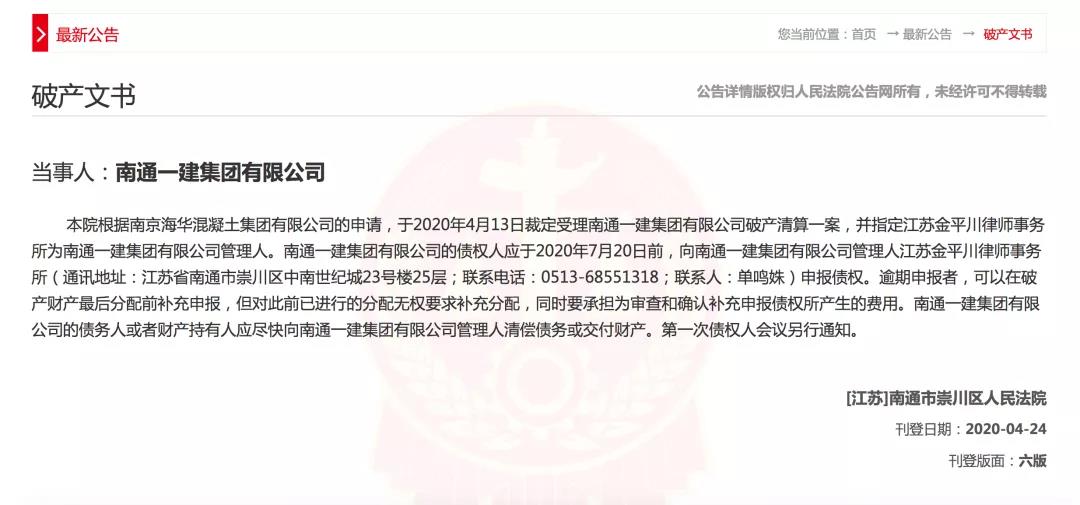 发布日期:2020-05-08 09:29:49 浏览量:898最近,人民法院公告网的一则消息吸引了很多人的注意:南通市崇川区人民法院于2020年4月13日,裁定受理南通一建集团有限公司破产清算一案。