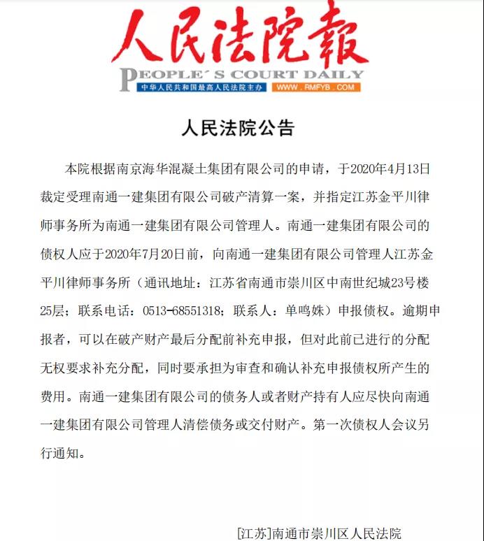 据人民法院公告显示,江苏省崇川区人民法院根据南京海华混凝土集团有限公司的申请,于2020年4月13日裁定受理南通一建集团有限公司破产清算一案,并指定江苏金平川律师事务所为南通一建集团有限公司管理人。