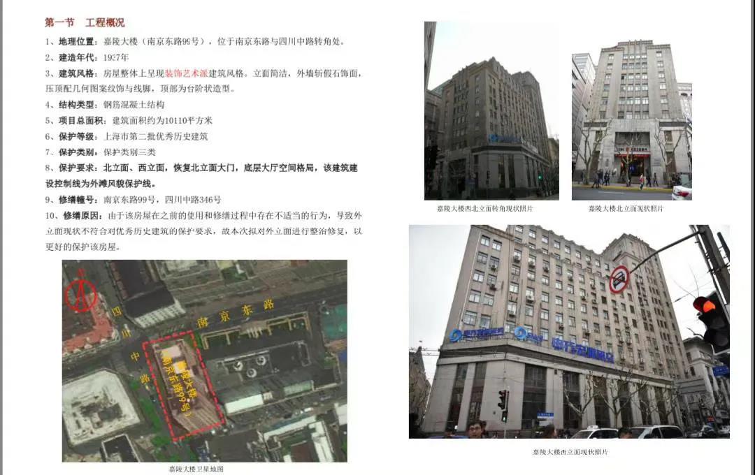 嘉陵大楼由大地产商、犹太人哈同所建,用他妻子中国女子罗迦陵的名字命名(后改为“嘉陵”)。大楼占地1084平方米,由英商德和洋行与世界实业公司联合设计,华商新申营造厂承包打桩工程,陶桂记营造厂承建,建筑面积10110平方米,1937年12月竣工。大楼北低南高,分别为8层、10层和13层,钢筋混凝土结构。建筑造型与文艺复兴风格的建筑大相径庭,没有繁复的装饰和线条,显示了近代建筑简洁明朗的风格。建筑立面是水泥錾假石和钢窗,底层勒脚采用金山石。内部水暖、消防设施齐全,用桃木做护壁,柳安木做地板。目前,嘉陵大楼位于外滩历史文化风貌区内,系第二批市优秀历史建筑,保护类别为三类。