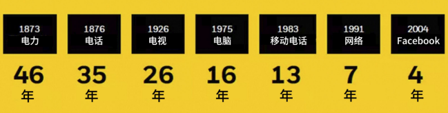 以美国为例,新技术从诞生到普及率达到总人口的25%所需时长如下图所示: