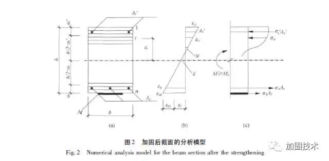 和加固前的分析方法类似,应用图2( b) 建立截面的几何方程,应用图2( c)建立平衡方程,补充纤维复合材料的物理方程,通过分级加曲率求解这些方程可获得第二阶段的M -Φ关系,完成接力计算。计算步骤和第一阶段基本相同。