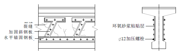 在箱梁、T 梁(或工字梁)梁腹粘结斜向钢板可使钢板与混凝土整体受力,提高主梁的整体刚度与抗剪强度。为防止梁体内原有钢筋或预应力钢索的锈蚀,粘贴钢板前应先在裂缝处灌入环氧树脂浆液,先封闭裂缝后再贴钢板, 加固示例见图7-3-2。