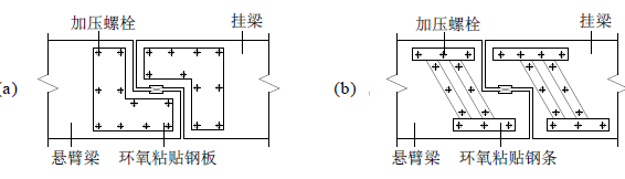 在悬臂梁牛腿处或挂梁端部粘贴钢板可增强构件的抗剪强度( 支座、牛腿处出现裂缝时),钢板通常为块状(图7-3-3a)或带状(7-3-3b )。带状钢板设置方向一般与主拉应力方向平行( 即与剪切裂缝方向垂直), 跨缝布置上下端设水平锚固板, 以提高端部的锚固强度,钢板厚度一般为10~ 15mm。